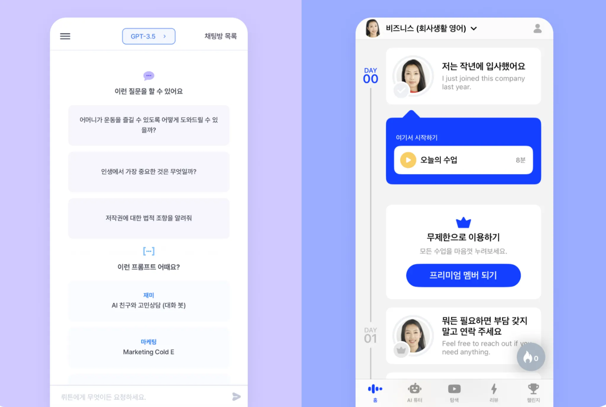 생성형 AI앱 뤼튼(왼쪽), AI튜터 영어회화 앱 스픽(오른쪽)